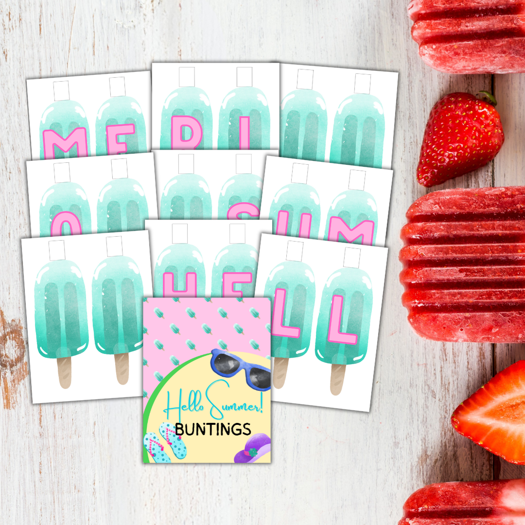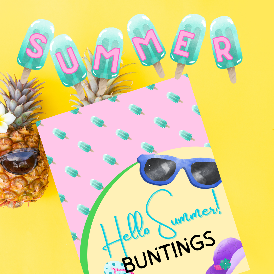 Kick off the sunny season with this colorful Hello Summer Buntings (Popsicle) printable! Featuring cheerful popsicle illustrations and bold seasonal lettering, this design adds a cool and playful vibe to your summer decor.