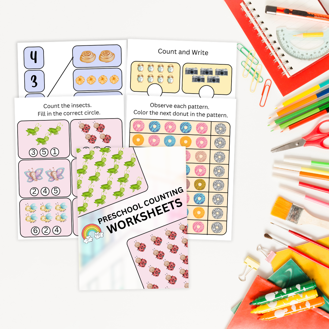 Perfect for young learners just starting to explore numbers, this printable set helps preschoolers develop number recognition and counting skills in a hands-on, engaging way. Each worksheet includes playful themes and visuals like animals, food, or everyday objects that encourage kids to count, write, observe, and match quantities.